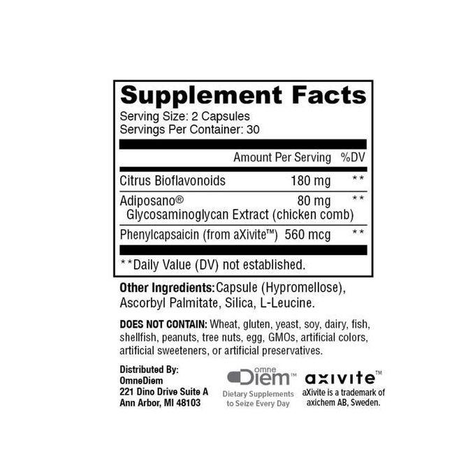 Thermogenic Weight Management from OmneDiem® combines our exclusive Adiposano® complex with innovative aXivite® phenylcapsaicin, a natural capsaicin analog shown to be safer, more effective and better tolerated than conventional chili pepper extracts.*